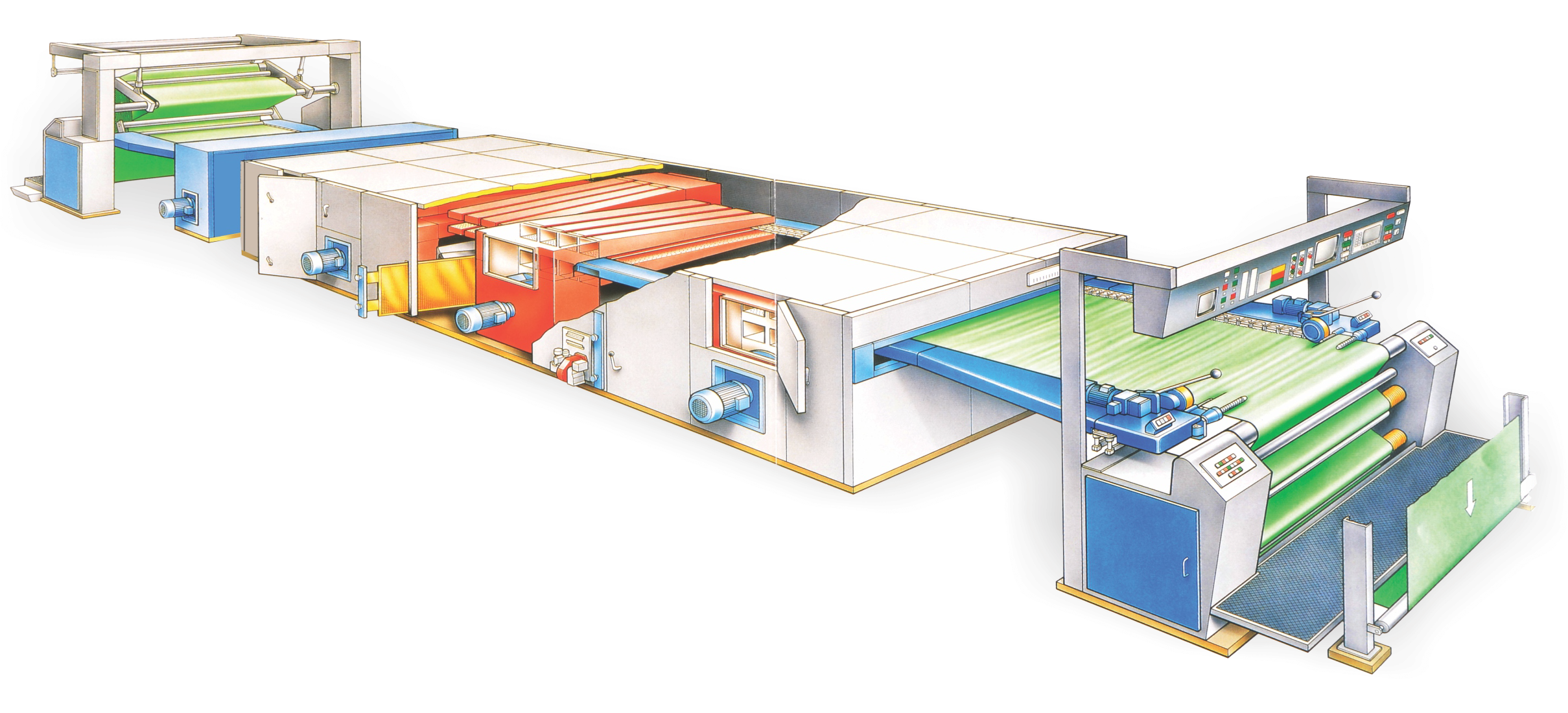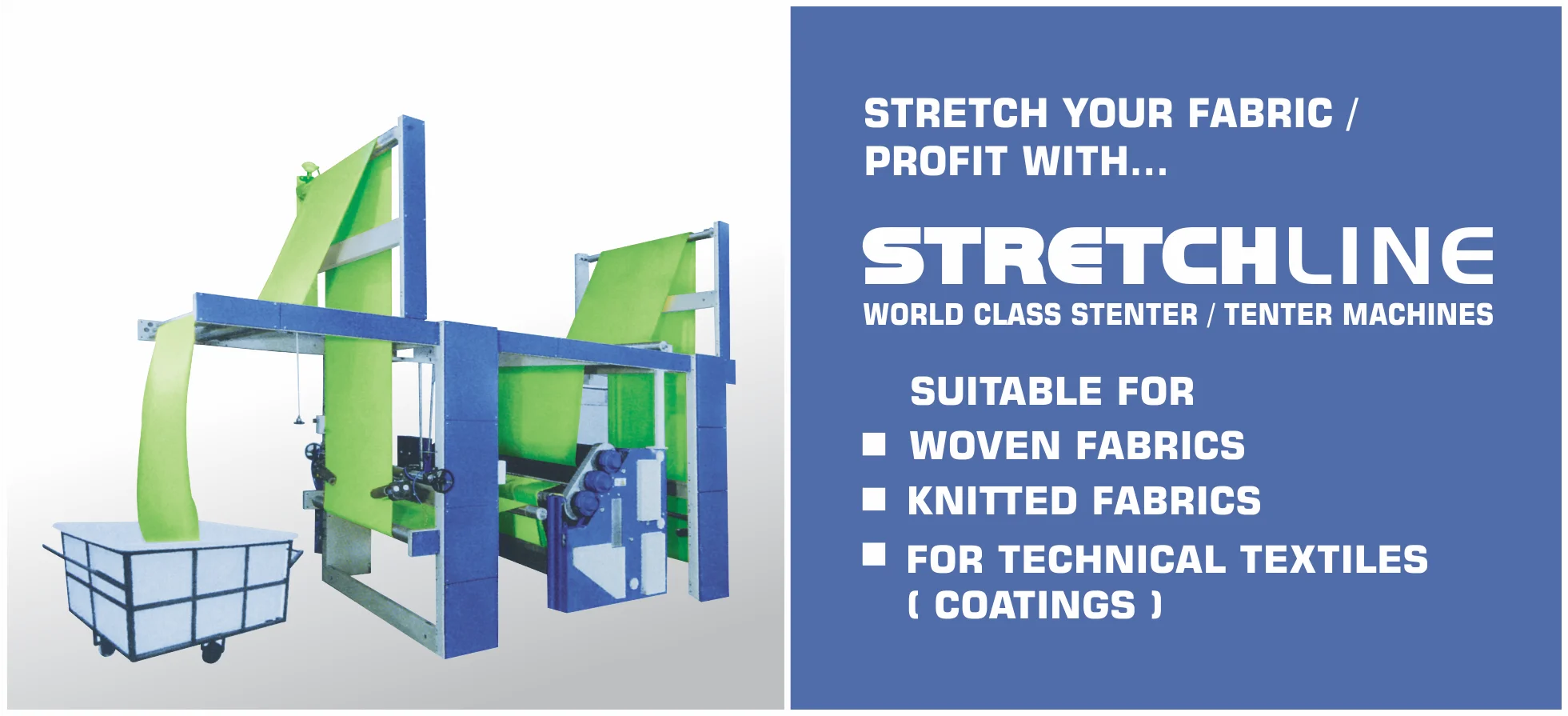 ONE SUCH KEY MACHINE OF INDISPENSABLE NEED IN FINAL STAGES OF PROCESSING OF WOVEN PRODUCT LINE IS STENTER. THE PERFORMANCE OBTAINED WITH A STENTER DEPENDS ON THE SPECIFIC NOVEL AND DYNAMIC DRYER DESIGNS. DUE TO EXORBITANT RISE IN THE ENERGY AND LABOUR COST CLUBBED WITH CUMULATIVELY GROWING PRESSURE OF COSTS IN ALL AREA OF TEXTILE PRODUCTION, OUR DEVELOPMENT EFFORTS IN THE STRETCHLINE STENTER